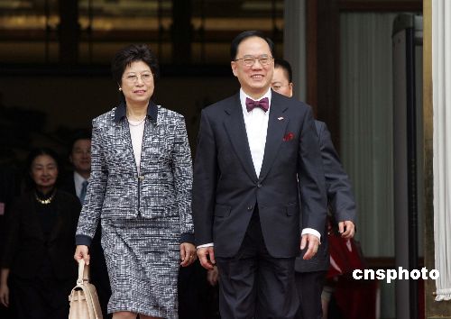 香港特區行政長官曾蔭權六月二十四日在北京人民大會堂香港廳宣誓就職。曾蔭權在完成就職宣誓儀式并與溫家寶總理會見后,喜氣洋洋走出人民大會堂。作者:毛建軍