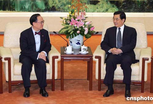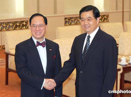 國家主席胡錦濤今天下午在會見香港特別行政區行政長官曾蔭權時,希望曾蔭權先生不負眾望,恪盡職守,奮發進取,為香港的繁榮穩定和發展作出新貢獻。作者:毛建軍