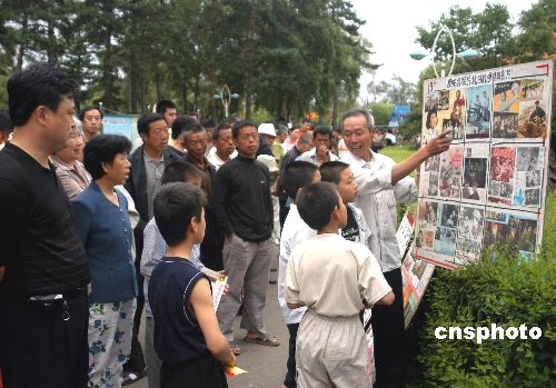 7月4日,牡丹江市空調(diào)機廠退休職工李易智把精心準備的抗戰(zhàn)勝利60周年畫板向市民展出,這是他連續(xù)6年的第600多場展出。作者:張克非