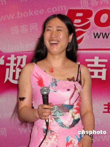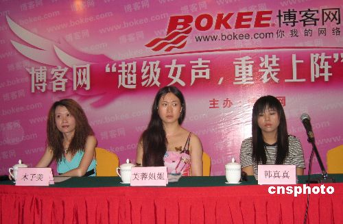 七月五日,由博客網主辦的“超級女聲重裝上陣”活動新聞發布會在北京舉行。備受中國內地網民關注的歌手韓真真(圖右1)全程代言此次比賽。“網絡紅人”木子美、芙蓉姐姐、流氓燕、竹影青瞳等作為嘉賓進行全程賽況點評。
