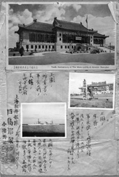 在一塊硬紙板上,這位日軍軍官特意將上海市市政府大樓被日軍轟炸前后作了比較。在被炸毀的上海市政府大樓照片中,還顯示出一塊寫有“上海神社建設地”的牌子。這幅照片的圖片說明注明當時日軍有在上海市府前建靖國神社的企圖。在同一紙板后面,所貼的照片顯示了當年上海火車站被炸毀的慘狀。