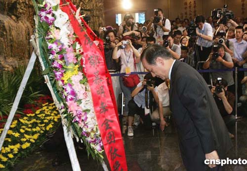 臺灣新黨主席郁慕明率領的臺灣新黨“民族之旅”訪問團七月十一日在北京盧溝橋參觀中國人民抗日戰爭紀念館并敬獻花圈。作者:毛建軍