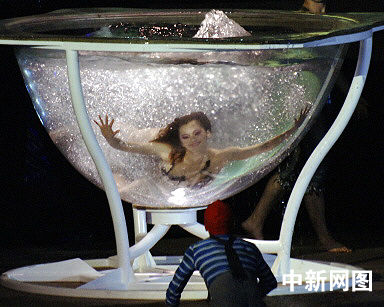 7月16日,2005世界游泳錦標賽在加拿大蒙特利爾開幕。圖為開幕儀式上一名游泳者在圓柱形的容器上表演。