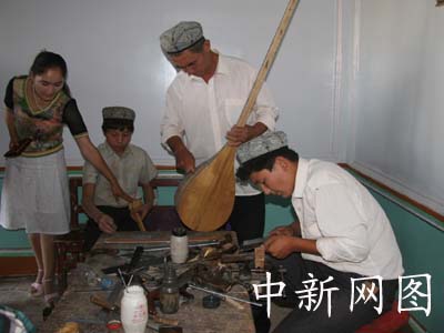 老藝人熱合曼·阿布都拉帶領孩子在做樂器