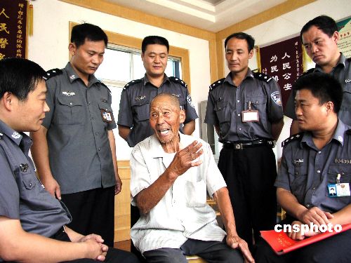 | 7月28日,83歲的抗日老英雄季長青(前中)來到山東棗莊市臺兒莊區公安分局泥溝派出所,為民警們上革命傳統教育課。季長青19歲參加抗日游擊隊,后來加入了八路軍,日軍投降后,他跟隨大軍南下,參加過渡江戰役和解放上海的戰役。由于他作戰勇敢,多次立功受獎,在1947年光榮地加入了中國共產黨,自1953年從部隊轉業回到家鄉泥溝鎮東黃莊村后,便利用各種形式向青少年及當地的干部群眾義務宣傳當年抗日的故事,至今義務宣傳已達50多年。作者:賈禮章