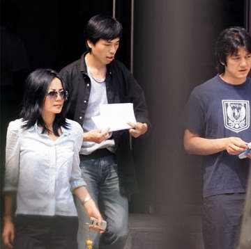 王菲扎著馬尾,穿一件黑色T恤和一條時尚的乞丐牛仔褲,戴一副超大號的黑色墨鏡,李亞鵬穿米黃色短袖襯衣、休閑褲。從兩人下車一直到在結婚登記處辦完手續,李亞偉不離左右,而穿淺藍色T恤的男士則用DV機進行跟拍。