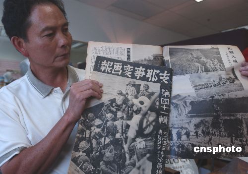 美國舊金山華人收藏家姜家聲展示在舊貨市場尋求的《支那事變畫報》,此為日本侵略中國和亞洲時期顯示戰功的出版物。姜家聲先生在今年七月紀念中國抗日戰爭勝利六十周年時,用以揭露日本發動戰爭的罪惡行徑。作者:賈國榮