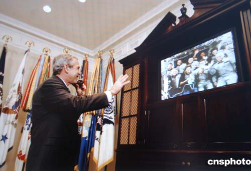 美國總統布什在白宮辦公室給太空中的發現號航天飛機機組打慰問電話。作者:賈國榮