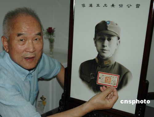 在“八·一三”淞滬抗戰紀念日即將到來之際,當年中國軍隊參謀長曾伯熹佩戴的證章自臺灣回到上海。圖為黃埔后裔、曾伯熹之子曾容威在上海家中展示該證章及曾伯熹著抗日軍裝的瓷畫像,兩岸淞滬抗戰文物在此“團圓”。作者:許曉青