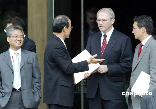 八月七日,第四輪六方會(huì)談美國代表團(tuán)團(tuán)長(zhǎng)希爾(右二)和韓國代表團(tuán)團(tuán)長(zhǎng)宋旻淳(左二)結(jié)束了上午的團(tuán)長(zhǎng)會(huì)后在釣魚臺(tái)國賓館芳菲苑臺(tái)階上交談。作者:廖文靜