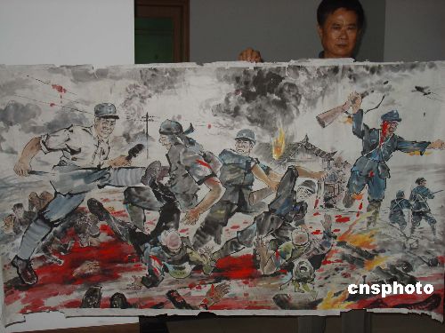 為紀念抗戰勝利六十周年,常德老畫家楊格正專心繪制其長幅畫卷《血戰常德》。整幅畫卷分為戰爭、救死扶傷、悼念三大部分,再現了當年常德會戰的情景。目前,兩幅長兩米、高一米,描繪戰爭場面的畫幅已經完成。作者:鄧霞