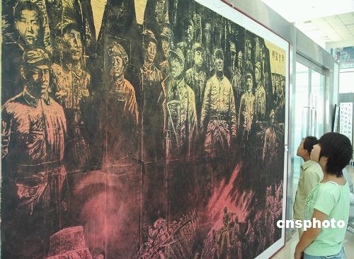 | 8月中旬,山西省陽泉市群藝館制作完成中國國內(nèi)最大的一幅版畫“太行豐碑”,此巨幅版畫是群藝館為紀(jì)念抗戰(zhàn)勝利60周年,組織9名美術(shù)工作者歷時(shí)一個(gè)半月共同創(chuàng)作完成的,版畫長3.60米,高2.40米,由百團(tuán)大戰(zhàn)等6部分組成,再現(xiàn)了抗戰(zhàn)時(shí)期我廣大軍民眾志成城、抗擊日寇的歷史場景。作者:續(xù)敏