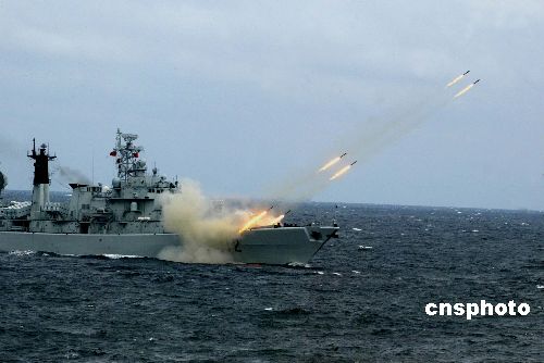 八月二十三日,“和平使命-2005”中俄聯合軍事演習第三階段——實施交戰的海上封鎖演練在中國山東半島及其附近海域開始。圖為中國驅逐艦發現目標后發射火箭彈。作者:王麗南