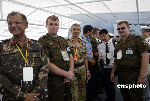 八月二十三日,上海合作組織觀察員國觀察員、俄羅斯軍官等,乘艦艇觀摩在中國山東半島及其附近海域進行的“和平使命——2005”中俄聯合軍事演習。作者:王麗南
