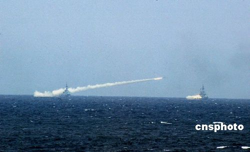 八月二十三日,“和平使命——2005”中俄聯合軍事演習第三階段在中國山東半島及其附近海域進行。圖為多艘護衛艦齊射艦艦導彈。作者:王麗南