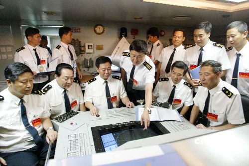 “和平使命-2005”中俄聯(lián)合軍事演習第三階段23日在中國山東半島及其附近海域開始。圖為參加演習的中國北海艦隊指揮員在指揮倉內(nèi)指揮演習的情景。作者:王麗南