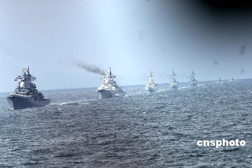 “和平使命-2005”中俄聯(lián)合軍事演習(xí)第三階段8月23日在中國山東半島及其附近海域舉行。圖為參加演習(xí)的中俄艦艇形成隊列,接受聯(lián)合導(dǎo)演部檢閱。作者:王麗南