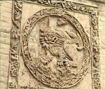 照壁中間的磚雕為一獨角猛獸,稱之為獨角獸,又名“廌”(音制),倉頡造“法”字便是根據獨角獸而造的,古代法字寫為“