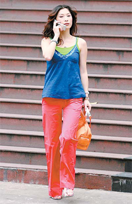 搭配示范:這套休閑混搭裝看起來(lái)非常搶眼,由于每件服裝單品的顏色純度都非常高,因此很容易給人帶來(lái)突出的感覺。這套服裝的撞色混搭將今年春夏流行的翠綠色、藍(lán)色以及玫瑰紅三種亮度極高的顏色搭配在一起,冷色調(diào)與暖色調(diào)的搭配充滿了活力,而今年也很流行將兩件小背心搭配穿著,外面的一件藍(lán)色棉布質(zhì)背心的領(lǐng)口上點(diǎn)綴著珠片,讓整體搭配在休閑中略見高貴。這身撞色休閑裝搭配適合膚色偏亮的女士穿著,尤其是白皙皮膚人士穿起來(lái)更出彩。