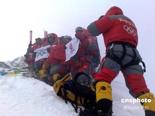 5月8日,北京奧運圣火珠峰傳遞登山隊成功登頂珠穆朗瑪峰。這是登山隊員在峰頂展示“祥云”火炬、火種燈、中國國旗、奧運五環旗和北京奧運會會徽旗。中新社發 阿旺扎西 攝