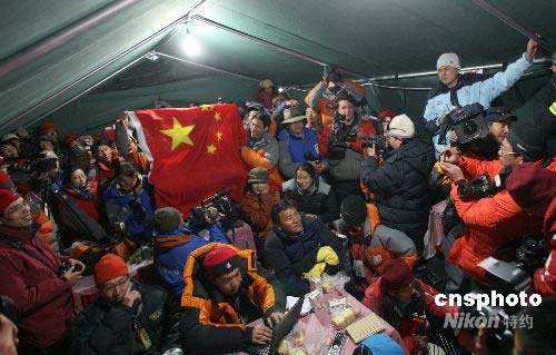 圖:珠峰大本營(yíng)歡慶圣火成功登頂珠峰