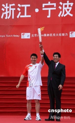 5月22日,舉國(guó)哀悼四川汶川大地震遇難同胞三天后,北京奧運(yùn)圣火在寧波繼續(xù)傳遞。圖為第一棒火炬手竺士杰從寧波市委書(shū)記巴音朝魯手中接過(guò)火炬。 中新社發(fā) 周兆軍 攝