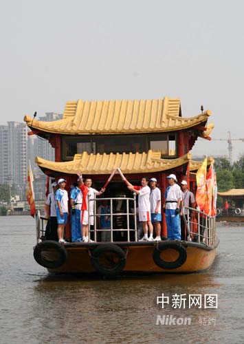 5月22日,奧運圣火來到浙江嘉興。圖為奧運圣火在南湖水上傳遞。