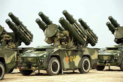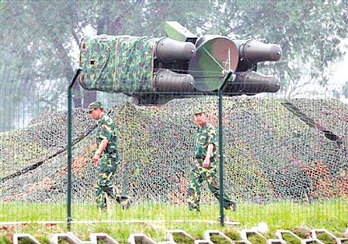 兩名中國士兵在“鳥巢”附近的防空導彈系統前巡