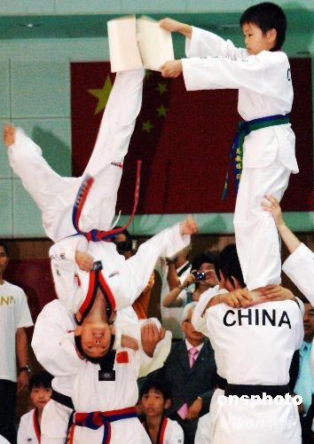 中國跆拳道小運動員在北京什剎海體校跆拳道訓練館,為29名將執(zhí)法北京奧運會的裁判員做精彩表演。中新社發(fā) 王東明 攝