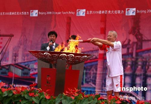 7月18日上午,北京奧運火炬圓滿結束了在“鋼城”遼寧鞍山的傳遞。圖為最后一棒火炬手聞寶滿點燃圣火盆。 中新社發 周兆軍 攝