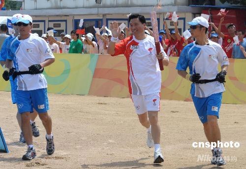 7月21日,奧運(yùn)火炬在山東青島傳遞,最后一棒火炬手青島市委副書記、市長(zhǎng)、奧帆委主席夏耕跑進(jìn)傳遞終點(diǎn)青島第一海濱浴場(chǎng),隨后他點(diǎn)燃圣火盆,青島傳遞結(jié)束。 中新社發(fā) 廖攀 攝
