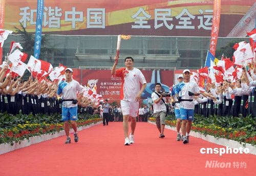 7月23日,奧運火炬在山東濟南傳遞,男籃國家隊前主力運動員鞏曉彬傳遞濟南首棒奧運火炬。濟南將在明年舉辦第11屆“全運會”。 中新社發 廖攀 攝