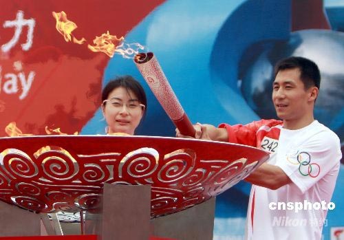 奧運火炬在山東濟南傳遞,中國跳水隊現(xiàn)役運動員郭晶晶、王峰共同傳遞濟南最后一棒火炬并點燃圣火盆。中新社發(fā) 廖攀 攝
