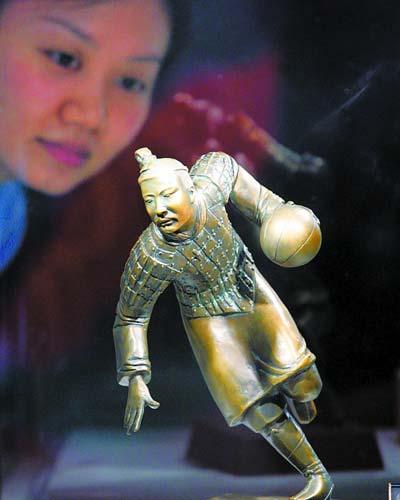 古老的兵馬俑練起了體操,踢起了足球。奧運(yùn)臨近,北京商家競(jìng)相開(kāi)發(fā)各類(lèi)具有中國(guó)特色的禮品,迎接各國(guó)來(lái)賓。限量100套的兵馬俑青銅運(yùn)動(dòng)雕塑在燕莎商城亮相,這是由一位年輕的雕塑師專門(mén)為奧運(yùn)“創(chuàng)意”的新作。 (記者 竇紅梅 戴冰攝)