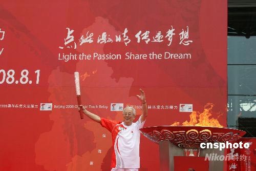 8月1日,伴隨第191棒火炬手點燃天津濱海國際會展中心的圣火盆,奧運會火炬接力天津站首日傳遞圓滿結束。中新社發 郭曉帆 攝