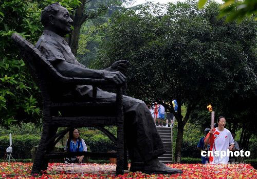 圖:女排選手陳靜在鄧小平銅像前傳遞奧運(yùn)火炬