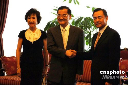 8月5日下午,中國國民黨榮譽主席連戰(zhàn)夫婦一行抵達(dá)北京首都機場,將觀禮北京奧運開幕式。圖為中共中央臺辦主任王毅在機場貴賓室會見連戰(zhàn)夫婦一行。中新社發(fā) 王東明 攝