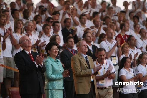 8月5日晚,參加北京奧運會的美國代表團在北京奧運村舉行升旗儀式,奧運村村長陳至立等出席。中新社發 武仲林 攝