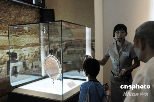 8月7日,北京奧運重要文化項目《世界瑰寶——中華人民共和國國際禮品展》在中國人民革命軍事博物館開幕。據悉,此次的國際禮品展堪稱中國國禮最全面的一次公開亮相。圖為講解員為參觀者介紹1963年阿拉伯聯合共和國蘇伊士運河管理局贈中國國務院總理周恩來的“銀刻字花邊圓盤”。中新社發 王宇婷 攝