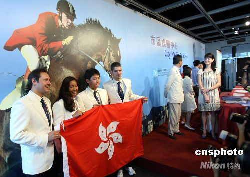 八月七日,出戰奧運馬術比賽的香港隊成員(左起)教練韓啟仁、選手林子心、鄭文杰及林立信首次在媒體中心與記者見面。 中新社發 洪少葵 攝