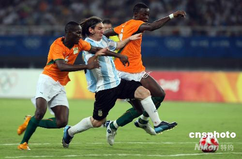 8月7日,北京奧運會上海足球分賽場男足預賽,在衛(wèi)冕冠軍阿根廷對陣科特迪瓦的比賽中, 阿根廷以2:1取勝迎來開門紅,球星梅西(MESSI Lionel)為阿根廷攻入本屆奧足賽首粒進球。圖為梅西帶球從人縫中突破。 中新社發(fā) 湯彥俊 攝