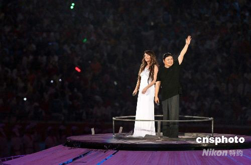 8月8日晚,北京奧運會開幕,中國著名男歌手劉歡和英國著名女歌星莎拉·布萊曼(Sarah Brightman)在“鳥巢”中央共同演唱北京奧運會開幕式主題歌《you and me》。 中新社發 任晨鳴 攝