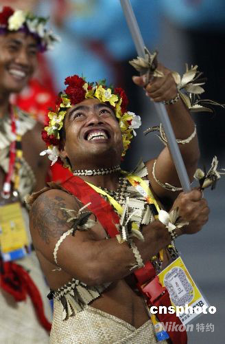 圖:基里巴斯代表團旗手身著民族服裝入場