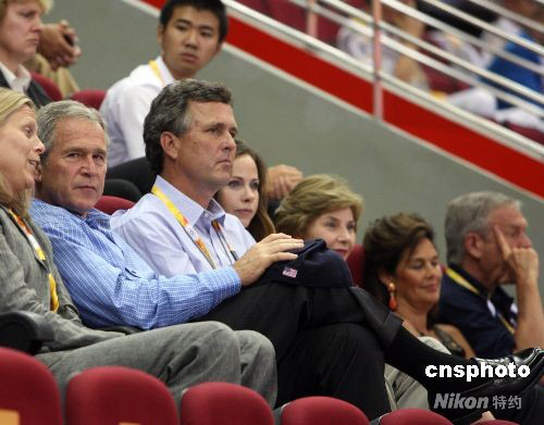 8月9日晚,雅典奧運會冠軍美國女籃在北京奧運會籃球館——五棵松體育館開始衛冕之旅,美國總統布什一家悄悄來臨,坐在奧林匹克大家庭普通看臺上觀看比賽,為美國女籃加油。中新社發 任晨鳴 攝