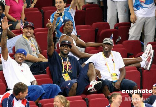 8月9日,美國總統布什一家來到五棵松體育館為美國女籃助威。同時前來為助威的美國男籃“夢八隊”的超級球星:詹姆斯、韋德、霍華德、安東尼等,向布什總統致敬。 中新社發 任晨鳴 攝