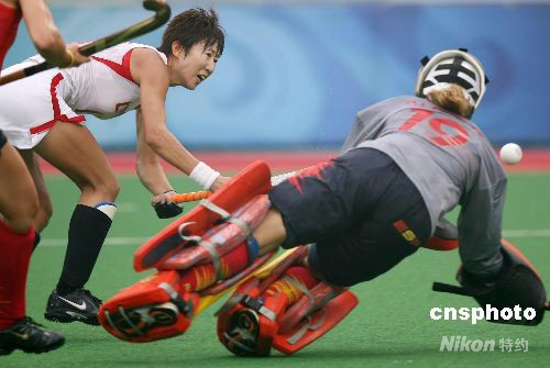 8月10日,中國女曲在奧運會女子曲棍球小組賽首場比賽中以3:0戰勝西班牙隊。圖為中國隊在進攻中。 中新社發 武仲林 攝
