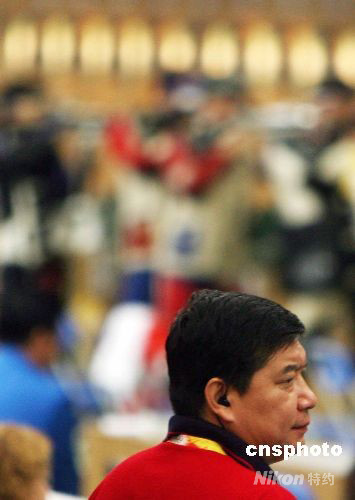 8月11日上午,中國選手朱啟南、曹逸飛爭奪北京奧運會男子10米氣步槍決賽權。中國射擊隊總教練王義夫現場觀戰。 中新社發 武仲林 攝
