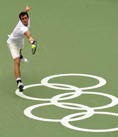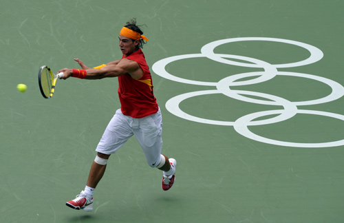 8月11日,在北京奧運(yùn)會網(wǎng)球男單首輪比賽中,西班牙選手拉斐爾·納達(dá)爾以2比1戰(zhàn)勝意大利選手波蒂托·斯塔拉切。王毓國 攝