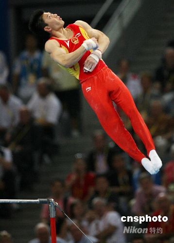 8月12日,中國隊在北京奧運會體操男子團體比賽中以286.125 分勇奪金牌。圖為李小鵬在單杠比賽中。 中新社發 武仲林 攝