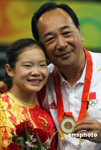 中國女子體操隊領軍人物程菲,將金牌獻給中國體操管理中心主任高健共同分享勝利的喜悅。中新社發 任晨鳴 攝